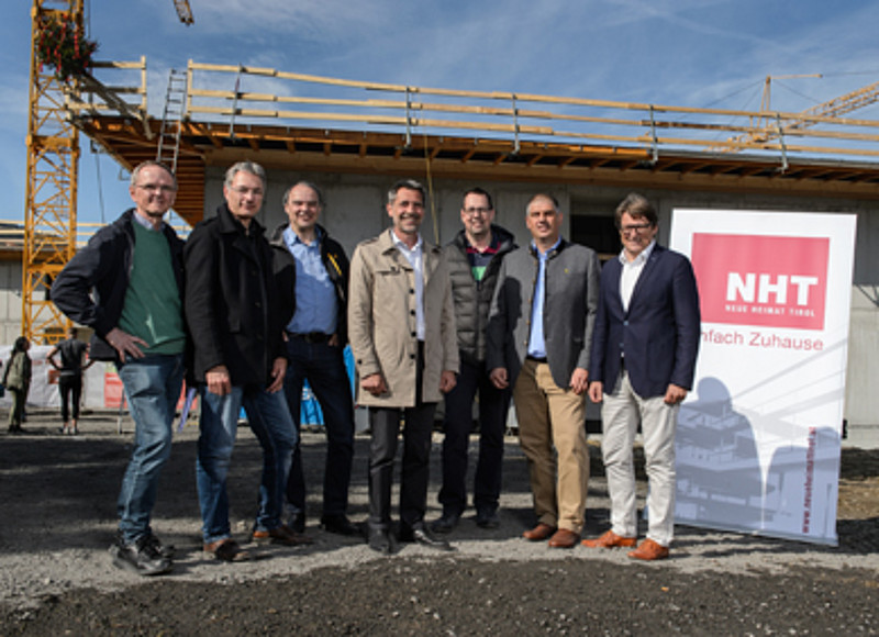 JOCHBERG (13.04.2017). Die Neue Heimat Tirol (NHT) errichtet derzeit in Jochberg in enger Zusammenarbeit mit dem Tiroler Gemeinde-Prozessbegleiter DASTA ein Generationenwohnhaus mit 21 Wohneinheiten und integrierter Kinderkrippe. Die NHT investiert insgesamt 3,7 Millionen Euro im Rahmen des Vorzeigeprojekts. Die Fertigstellung ist bis Ende 2017 geplant. Kürzlich wurde die Dachgleiche gefeiert.