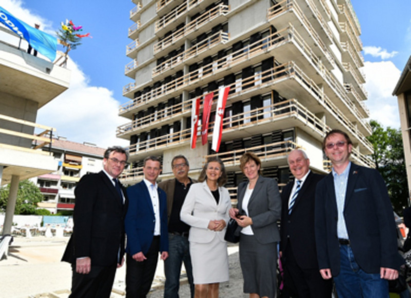 INNSBRUCK (22.05.2017). Die Neue Heimat Tirol (NHT) plant in den nächsten Jahren die Errichtung von über 1.000 neuen Wohnungen in Innsbruck. Auf einem Baurechtsgrundstück der Pfarre St. Paulus laufen seit Ende März 2016 die Bauarbeiten für 70 Mietwohnungen, einer Einheit für betreutes Wohnen sowie einen Kindergarten mit Kinderkrippe samt gemeinsam genutzter Tiefgarage. Das Investitionsvolumen beträgt 13,3 Mio. Euro. Die Fertigstellung ist bis Ende 2017 geplant. Am Montag wurde die Dachgleiche gefeiert.