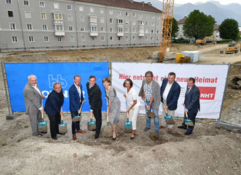INNSBRUCK (21.07.2017). Die Neue Heimat Tirol (NHT) errichtet im Rahmen einer Innenhofverbauung in der Gumppstraße zwei Wohngebäude mit insgesamt 32 Mietwohnungen. Zusätzlich entsteht eine Tiefgarage mit 150 Abstellplätzen. Die Fertigstellung ist bis November 2018 geplant. Diese Woche wurde der Spatenstich gefeiert. Die NHT investiert 7,7 Mio. Euro.
