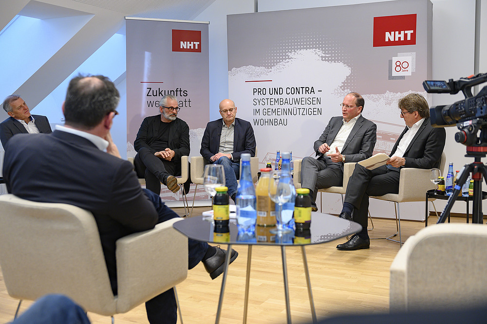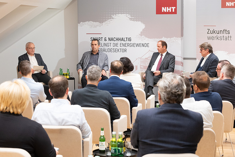 Eine hochkarätige Expertenrunde machte sich bei der vierten Auflage der NHT-Zukunftswerkstatt auf die Suche nach Rezepten für billigeres Bauen. Dabei diskutierten die beiden NHT-Geschäftsführer Hannes Gschwentner und Markus Pollo mit Innungsmeister Anton Rieder, 1. LH-Stv. Georg Dornauer und Finanzexperte Gunter Deuber von Raiffeisen Research über die Folgen der Teuerung im leistbaren Wohnbau.